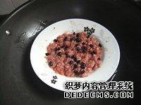 第5步:将调味豆粉炒熟。发酵后,将大豆除去。此时,大豆看起来像发霉的丝绸。用刀将这些大豆包好,然后准备辣椒。将辣椒,芝麻,五香粉,生姜,大蒜倒入锅中,与大豆一起炒,加入适量的白葡萄酒并混合好啊